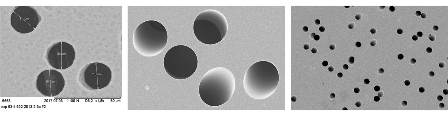 The precision filtration of fluids and gases in biotechnology, pharmacology, chemistry, microelectronics and other science and technology applications are ensured with our track membranes. The ranges of application of track membranes are extensive. The track membrane is a thin polymer film with through pores. Track membranes are made by irradiation of solid films with heavy elements ions and then etching their tracks until the through uniform pores are formed. Track membranes are stable to contacts with microorganisms. The geometry of their porous structure doesn’t change along with the ion strength of the medium being filtered. Thermal and chemical stability allows to sterilize membranes by all the known methods.